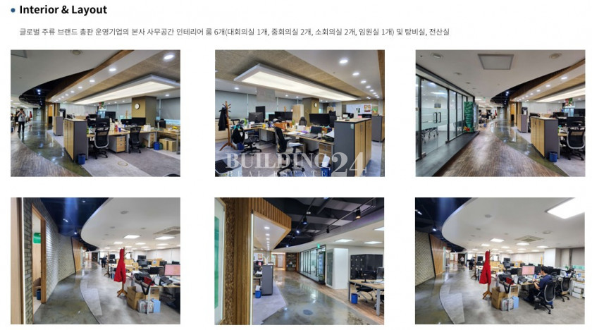 룸 6개(대회의실, 중회의실 2개, 소회의실 2개, 임원실 1개) 탕비실, 전산실